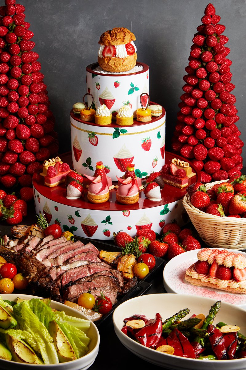 シェフが炭火で丁寧に焼き上げるトマホークステーキと、旬のいちごを贅沢に使用したスイーツの饗宴。🍓