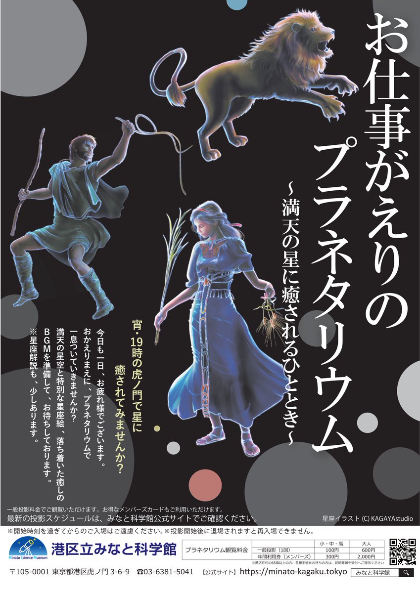 今日も1日お疲れ様です。お帰り前に、プラネタリウムで一息ついていきませんか?満天の星と特別な星座絵、落ち着いた癒しのBGMを準備して、お待ちしております。星空解説も少しあります。
