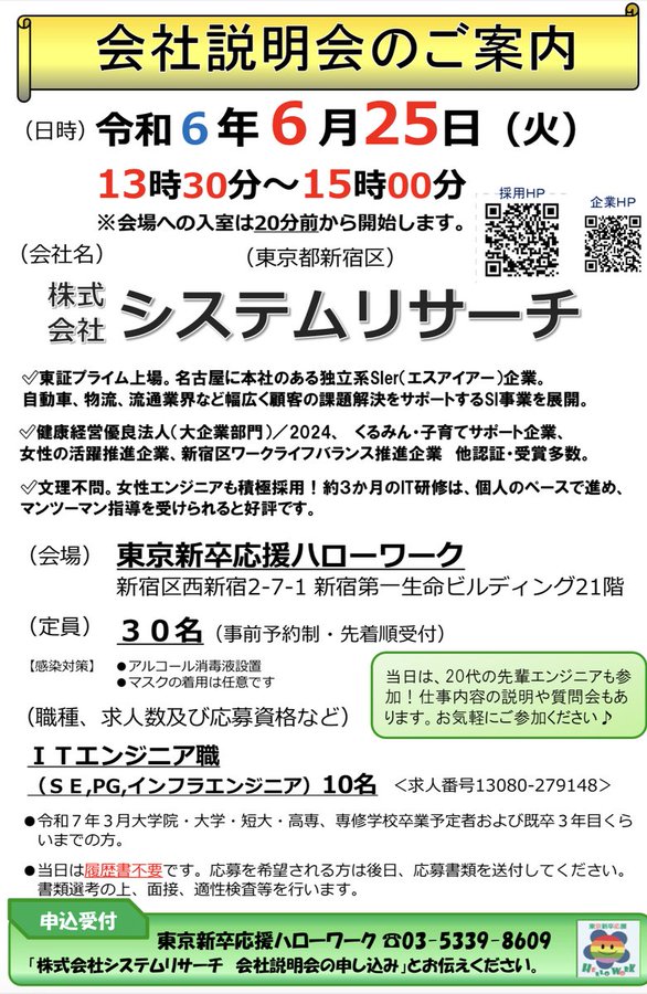 イベントのお知らせ 6月25日(火)13:30〜 【(株)システムリサーチ】 健康経営優良法人(大企業部門)/2024、 くるみん・子育てサポート企業 他認証・受賞多数 6月25日(火)14:00〜 【(一財)日本不動産研究所】 年間休日123日、有給休暇は入社時20日あり #25卒 #就活生