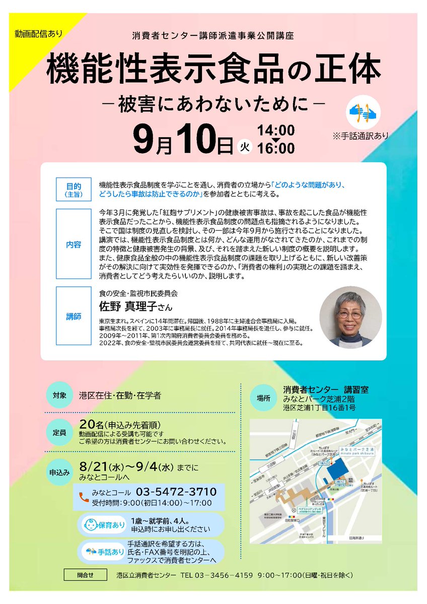 消費者センター公開講座 参加者募集中 #機能性表示食品 の正体 -被害にあわないために‐ 開催日時:9/10 14:00-16:00 会場:消費者センター(みなとパーク芝浦2階) 申込:9/4までにみなとコールへ。[申込先着順] ℡03-5472-3710 詳しくはコチラ https://city.minato.tokyo.jp/shouhisha/kousihaken01.html…