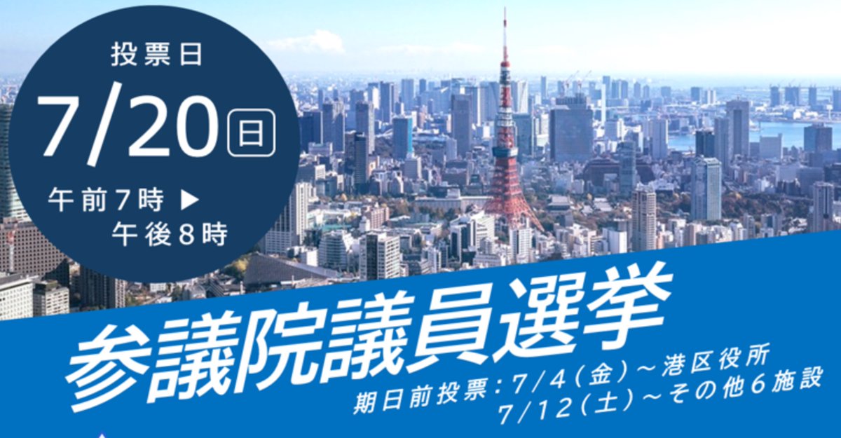 /参議院議員選挙・期日前投票実施中\本日から港区役所1階のほか、各地区総合支所などを加えた合計7会場で投票できます期日前投票は7月19日(土)まで各地区総合支所、台場分室、さんぽーと港南未来を選ぶ一票..