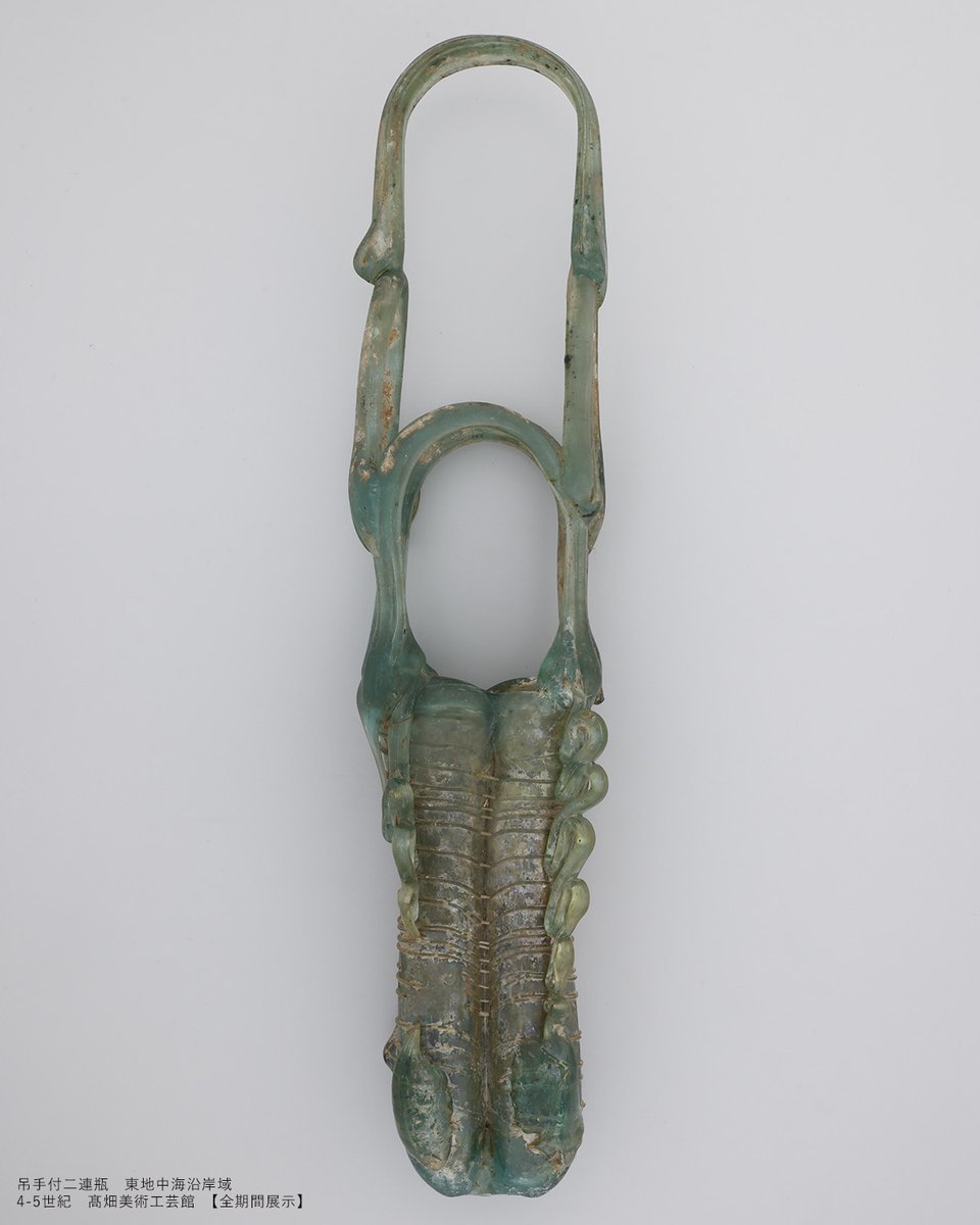 \ぐねぐね/ 高さ30センチを超える大型の二連瓶。胴体側面の細かな波のような装飾は、熔けたガラスを紐のように伸ばしながら、道具で折り畳んでいくようにして表現したもの。手早く的確な職人技が光る逸品です。 #吹きガラス展 #マニアック技法解説 #初公開