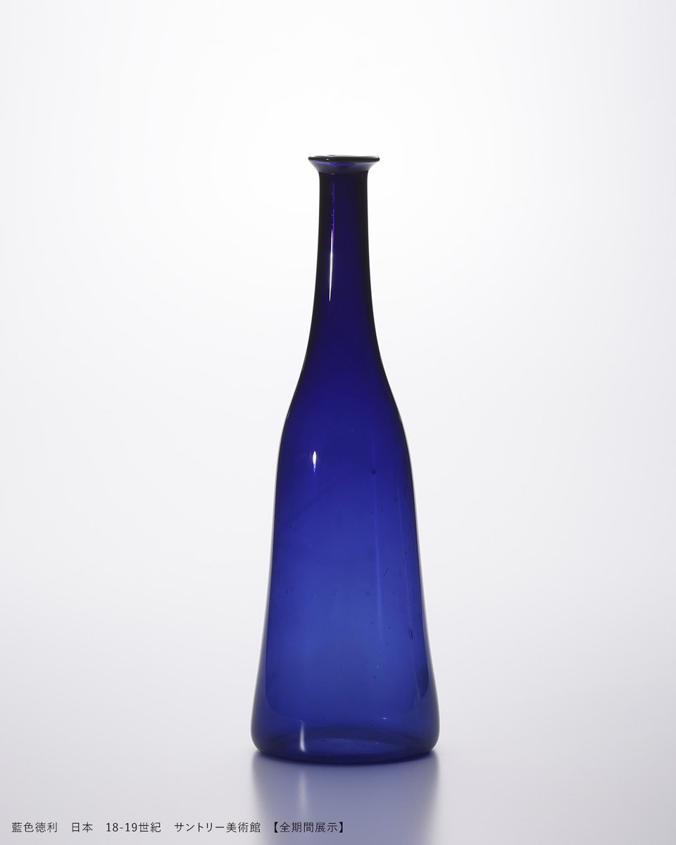 \するりん/藍色のガラスを薄く吹いて作った徳利。装飾のないシンプルな作品ながら、細長い頸から肩、そして底へとゆるやかに広がる形がなんとも美しい。宙吹きならではの自然な曲線です。#吹きガラス展#マニアッ..