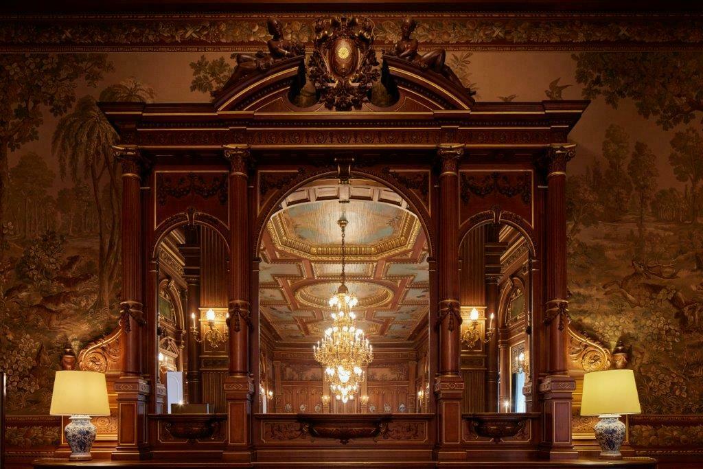 #花鳥の間の北側中央には大食器棚が設置されていますが、その左右の壁には、草花咲き乱れる森の中で鳥獣を追う猟犬の群の様子をデザインした#織物が張られています。これらの織物は、かつてフランス製のゴブラン織..