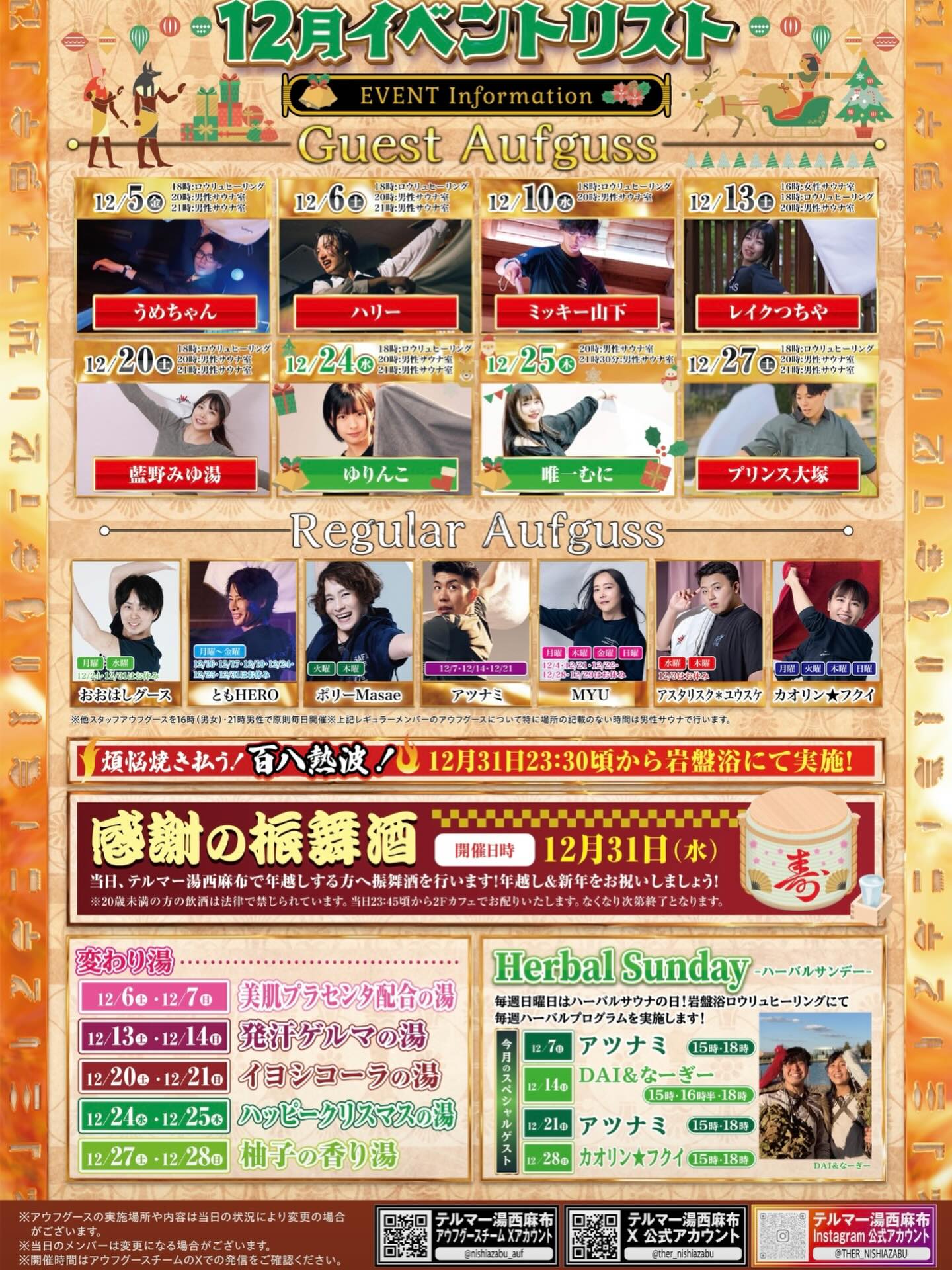 .【12月イベント】🔥アウフ12/5うめちゃん12/6ハリー12/10ミッキー山下12/13レイクつちや12/20藍野みゆ湯12/24ゆりんこ🎄12/25唯一むに🎄12/27プリンス大塚🌱Herbal..