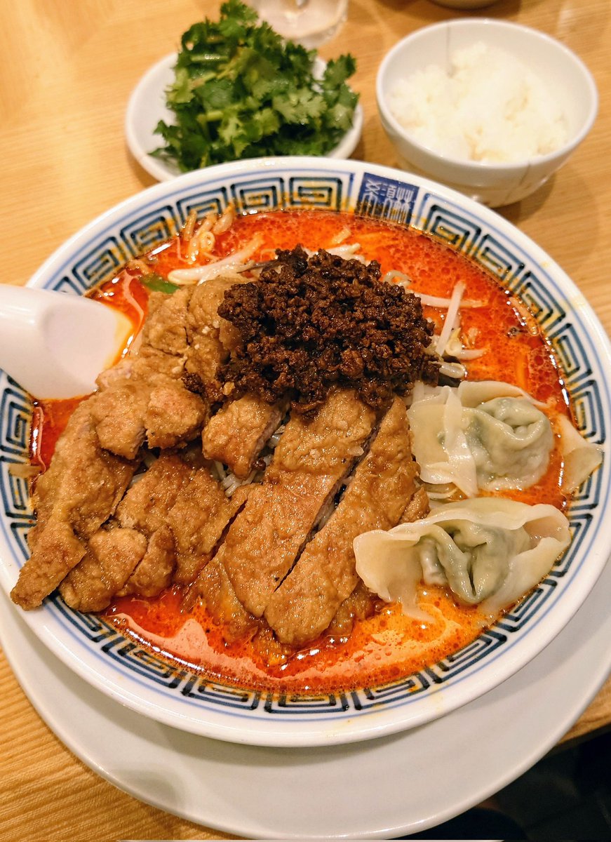 初訪問【希須林赤坂】『排骨担々麺🌶🌶🌶+パクチー雲呑+パクチー+ライス無料』❤️程良い辛さのクリーミーなスープは胡麻と辣油の旨味がシッカリと感じ美味しい❗ボリューム有る排骨👍パクチー雲呑も👍途中からパ..