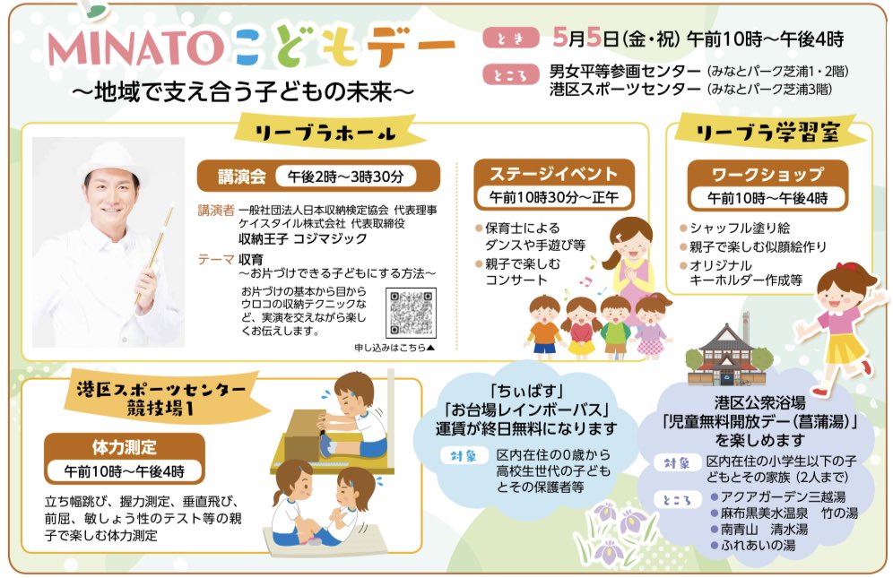 \🎏本日5月5日は #MINATOこどもデー🎏/🔸お子さんと保護者の方は#ちぃばすや#お台場レインボーバスの乗車#無料🚌🔸#お片づけできる子どもをテーマに収納王子#コジマジックの講演会など楽しい企画..