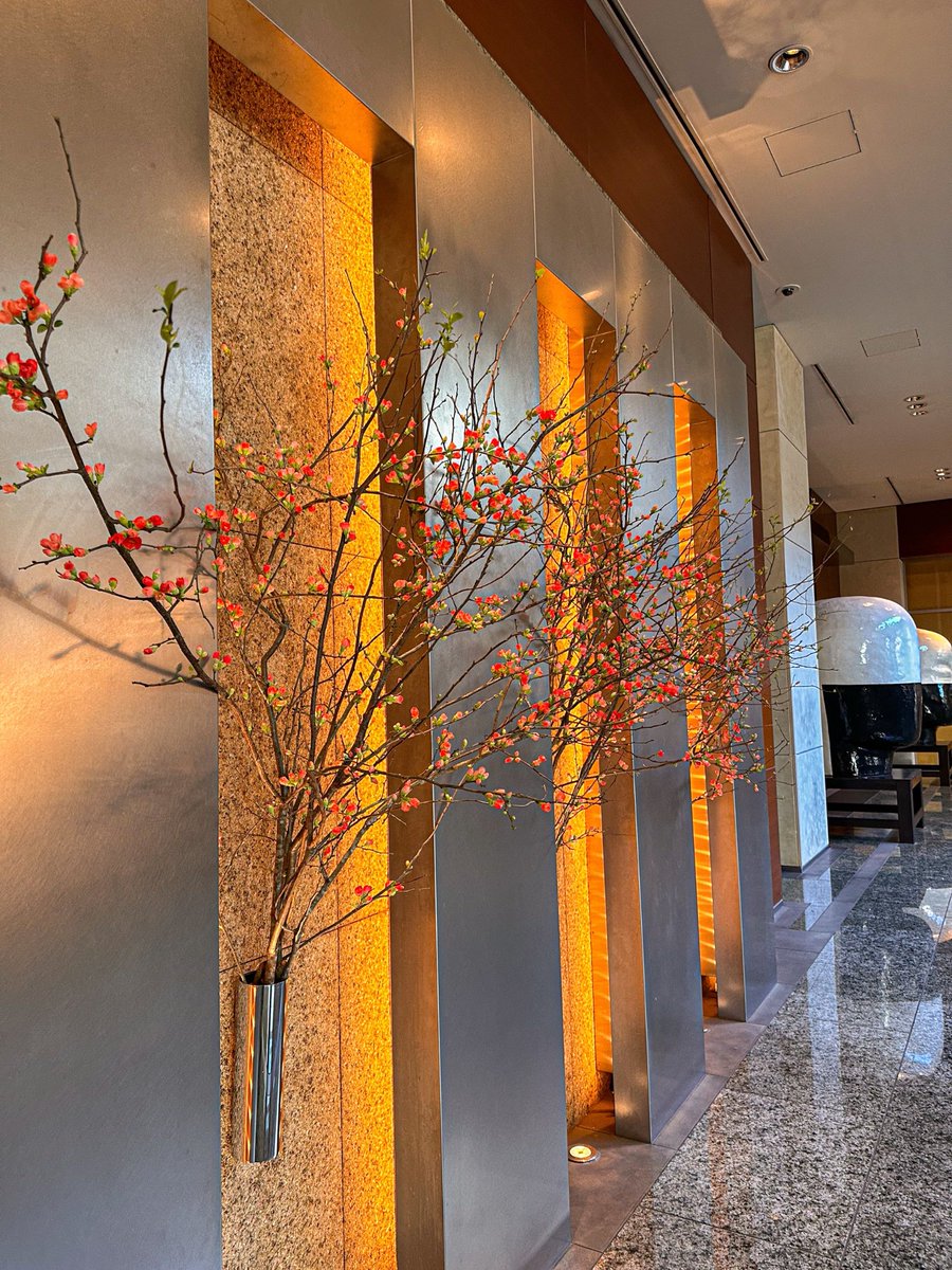 【季節のロビー装花】今季は赤くて小さな花が可愛らしい木瓜(ボケ)が、皆さまをお迎えしております🏵013