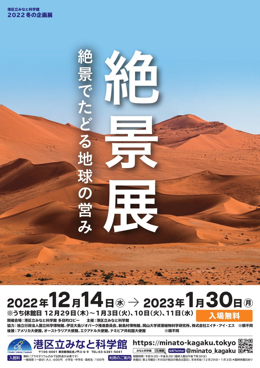 冬の企画展2022🏜️「絶景展~絶景でたどる地球の営み~」開催中!本企画展では大地・大気と海・生物の活動によって作られた世界各地の絶景の中から4つをご紹介。絶景のVR体験やカード作りなどお子さまも楽し..