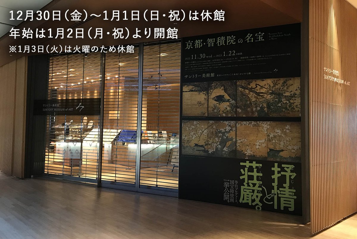 \本年もありがとうございました/ #サントリー美術館 は明日12/30(金)から1/1(日・祝)まで休館します。本年もご愛顧いただき、誠にありがとうございました。年始は1/2(月・祝)10時より開館します。 #智積院展