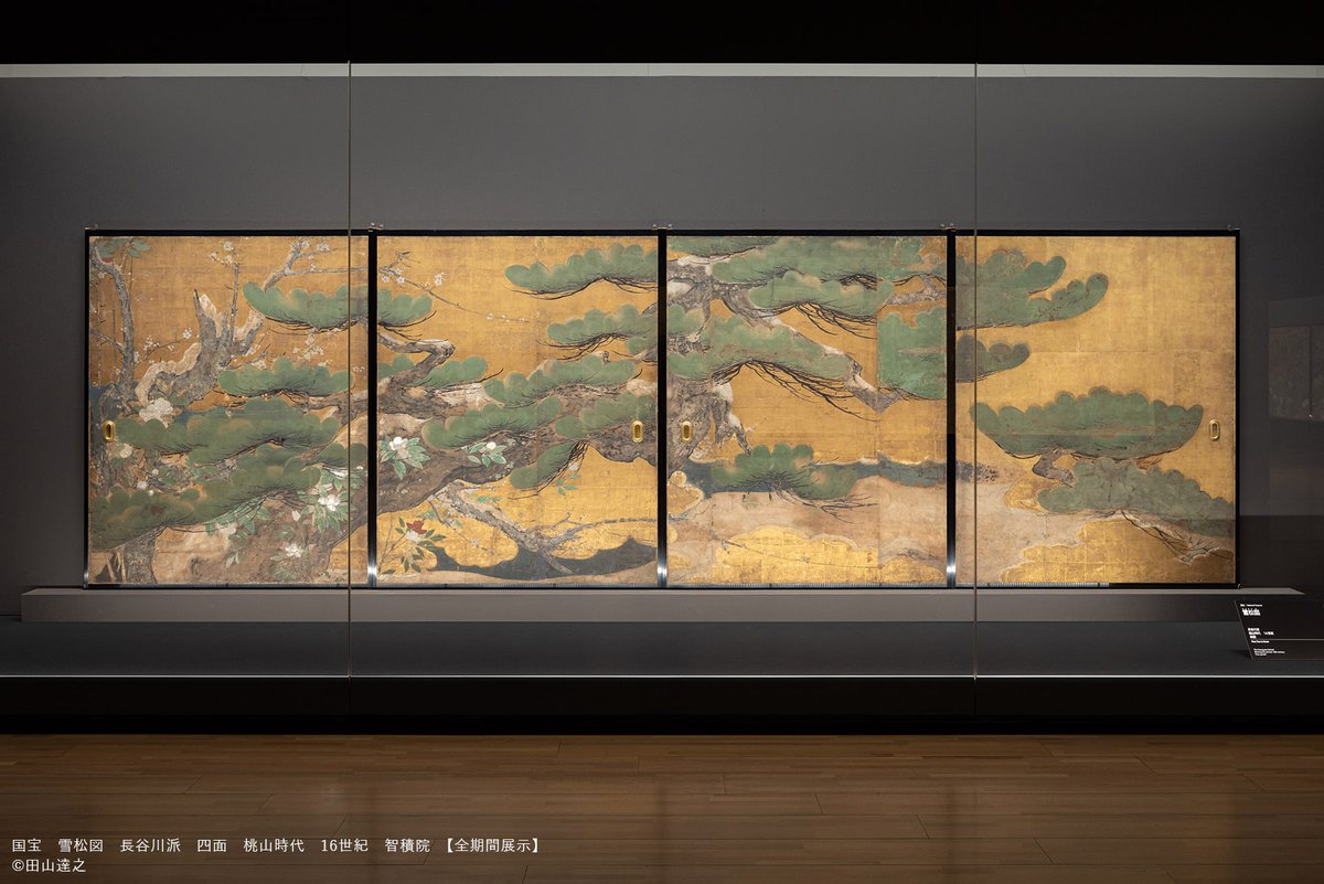 \国宝 雪松図/ 2023年開館初日!お正月らしく門松をあちこちで見かけますが、 #智積院展 からは国宝《雪松図》をご紹介。雪を被った松の姿は、まさに今の季節にぴったりですね。冬の花木である椿や梅も描かれ、日本の冬らしい情緒が漂います。