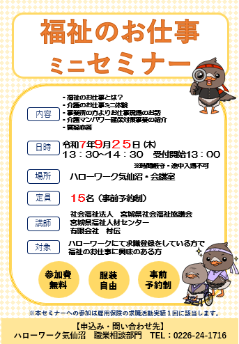 9/25(木)ハローワーク気仙沼で、「福祉のお仕事ミニセミナー」を開催いたします!受付開始13:00~、13:30~14:30の時間で開催いたします!対象者は、ハローワークにて求職登録をしている方です! ☆参加申し込みはハローワーク気仙沼 職業相談部門 TEL 0226-24-1716 #福祉 #介護 #求職活動