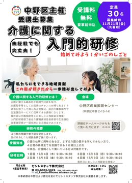 介護の仕事の経験がない方へ 介護に関する入門的研修を開催 基礎を学べる研修とおしごと相談会を開催します(要申込・先着30名)。学生も参加可能。介護の仕事をやってみませんか。 ▼日時 12月4日、5日、8日、9日 9時30分~16時30分 ▼会場 中野区産業振興センター 詳細は https://city.tokyo-nakano.lg.jp/kenko_hukushi/kourei/kaigohoken/kaigoservice/mikeikensyamuke.html…