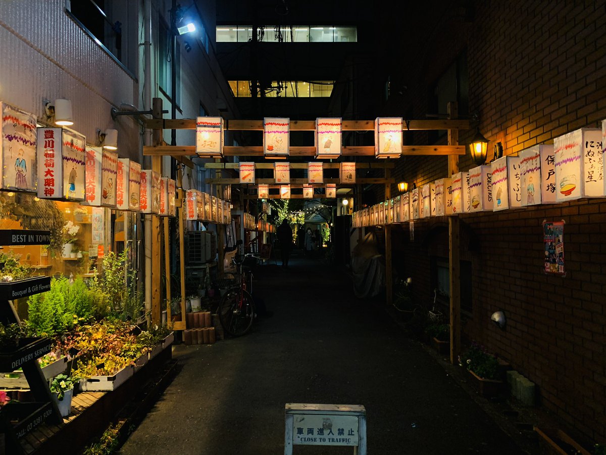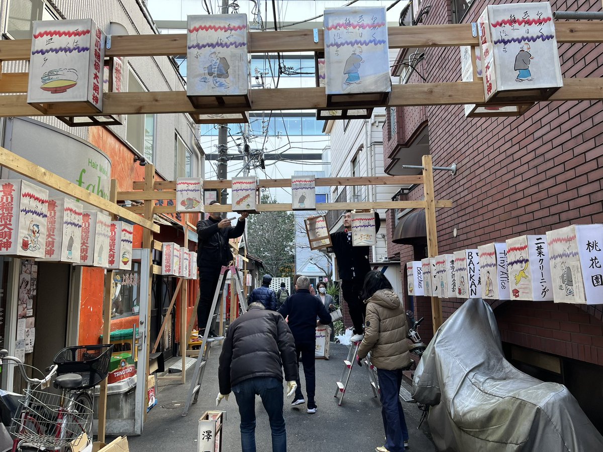 その後は桃園商店街の行燈祭の行燈設置を。夜になれば灯りがともります。