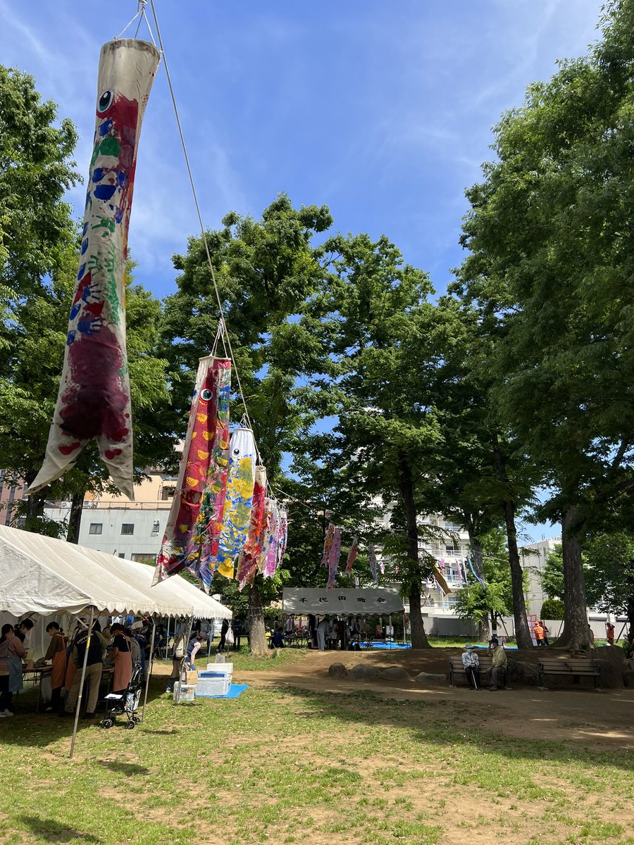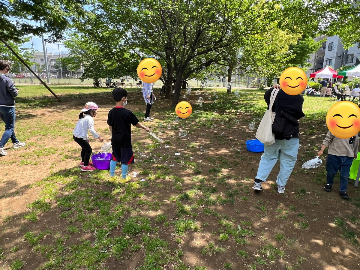 本日、本五ふれあい公園にて、「大きなこいのぼりと防災スタンプラリーをやってます。プレーパークチームでしゃぼん玉コーナーをやっています。