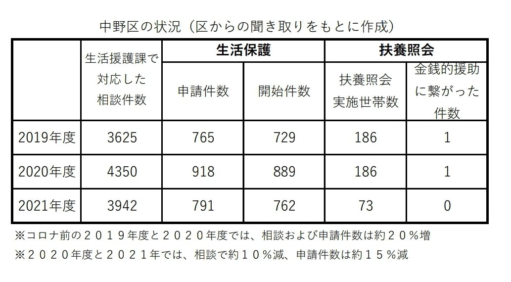 中野区での扶養照会実施率が低いことは、良いことです(表は、議会質問や聞き取りなどで明らかになった件数をまとめたもの)。自治体でこれだけの差があるとは‥。中野区ではコロナ前の2019年も金銭的援助に繋がった件数はわずか1件でした。百害あって一利なしの扶養照会は不要です。廃止すべきです。