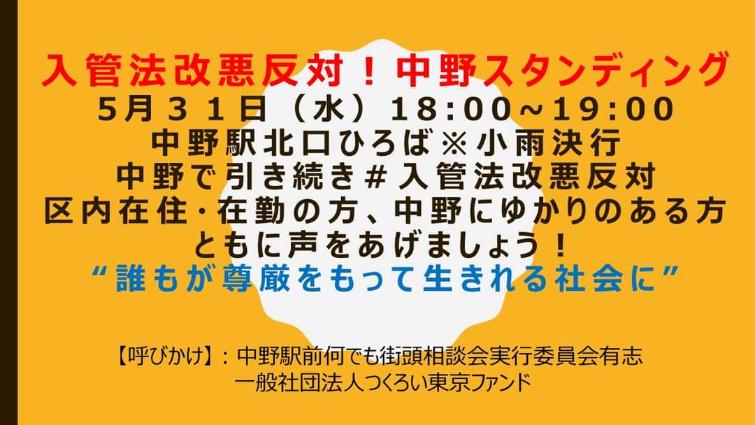 先週に続き今週31日(水)も中野駅北口での #入管法改悪反対アクション がおこなわれます。強行採決が狙われる中、ともに声を。