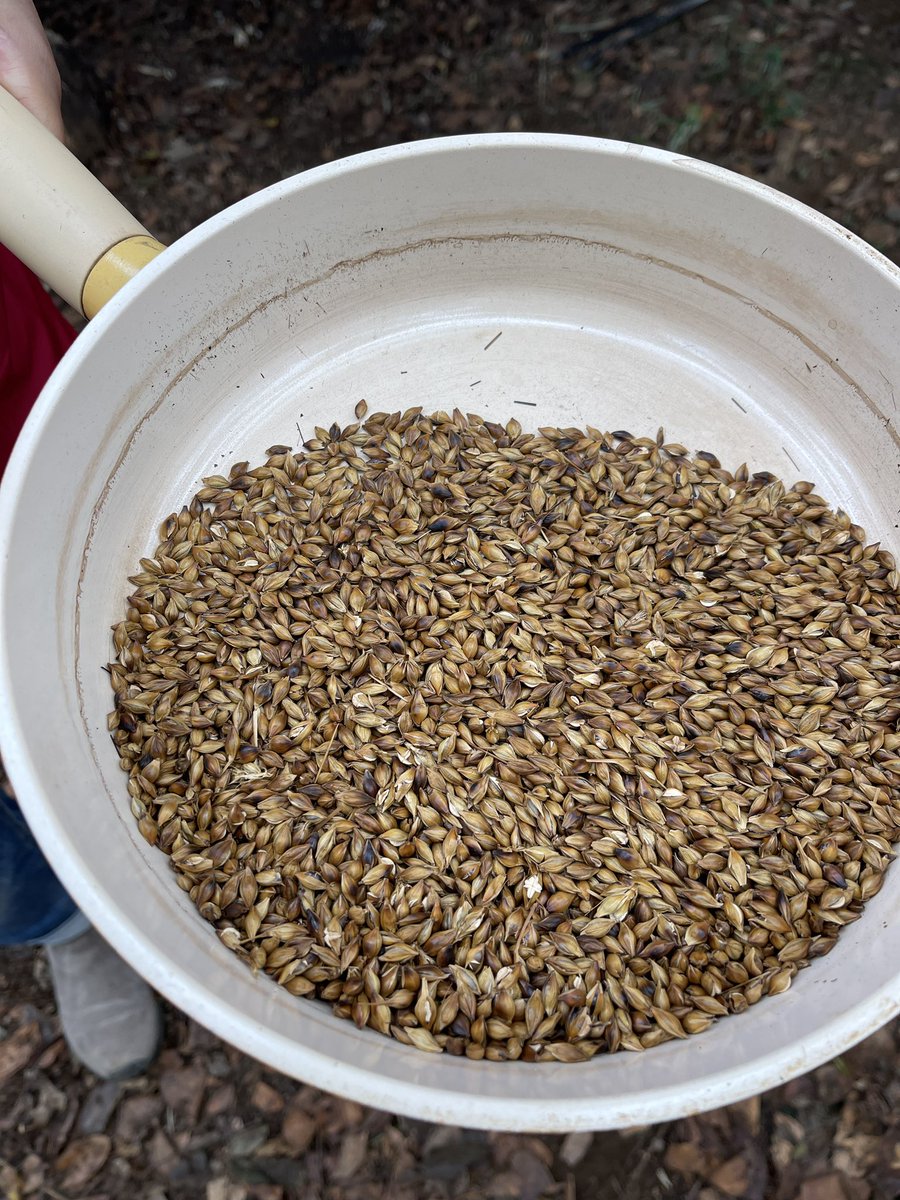 強火にするとポンと弾けて、麦ポンができるんだよ。ほんのり甘くて美味しかったから、たくさん麦を育てて麦茶も麦ポンもビールも…!🍺