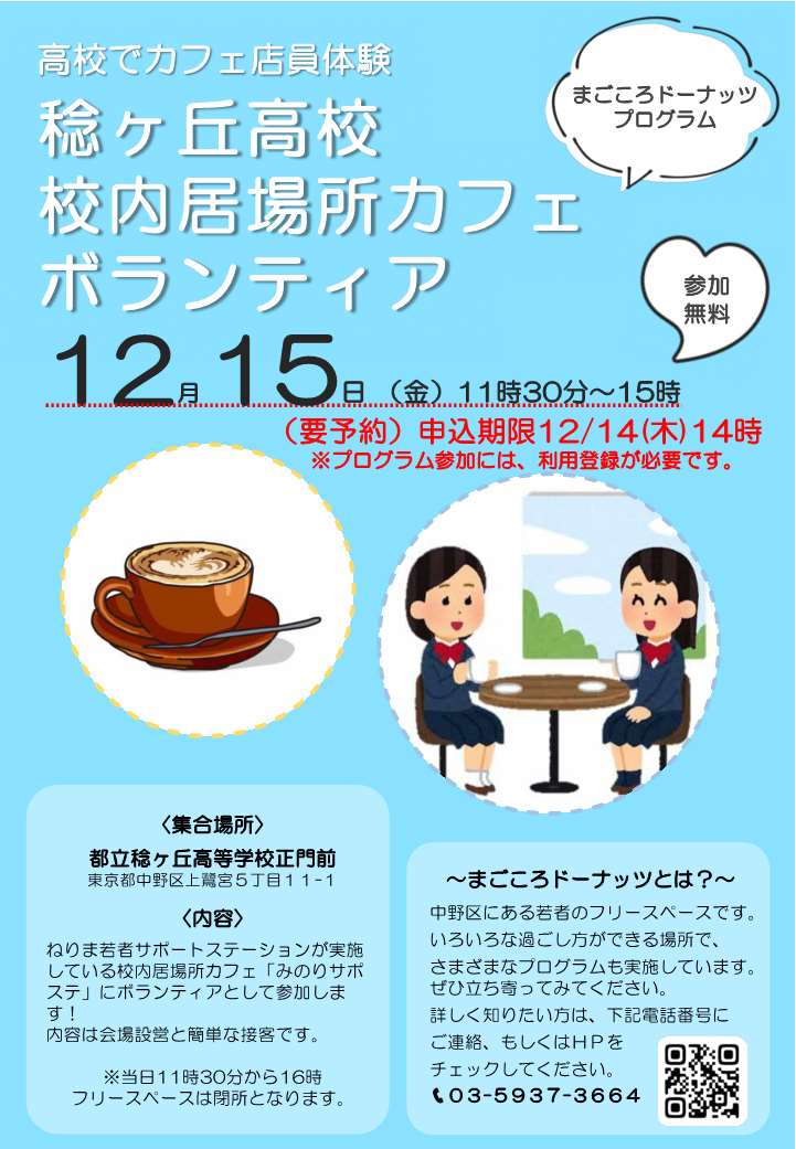 「ねりま若者サポートステーション」主催の校内居場所カフェ「みのりサポステ」の会場設営や接客のボランティアを行います。