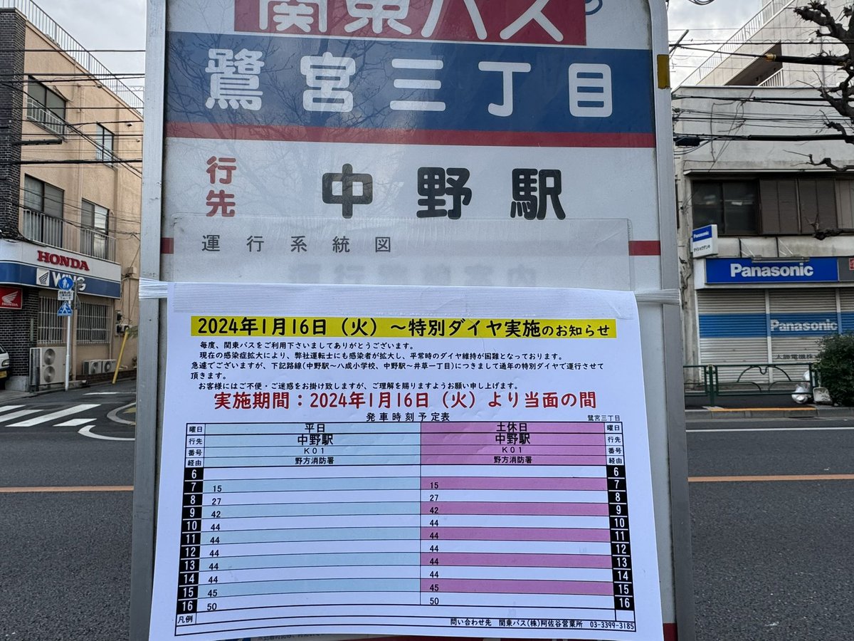 写真は、中野駅方面へ向かう鷺宮三丁目のバス停の時刻表です。