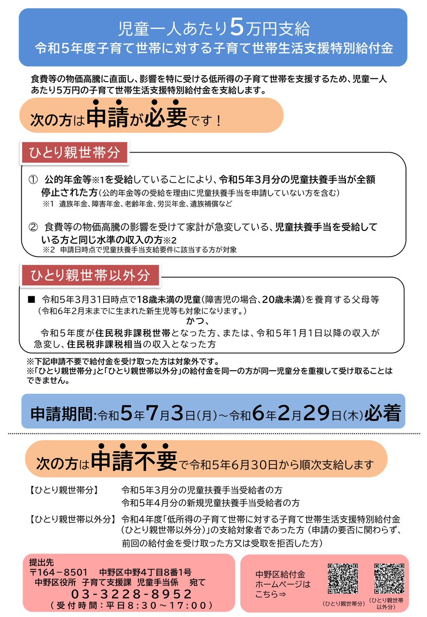 物価高騰による家計負担を支援するため、対象世帯へ児童1人あたり5万円を支給します。申請が必要な方はお早めに申請してください。