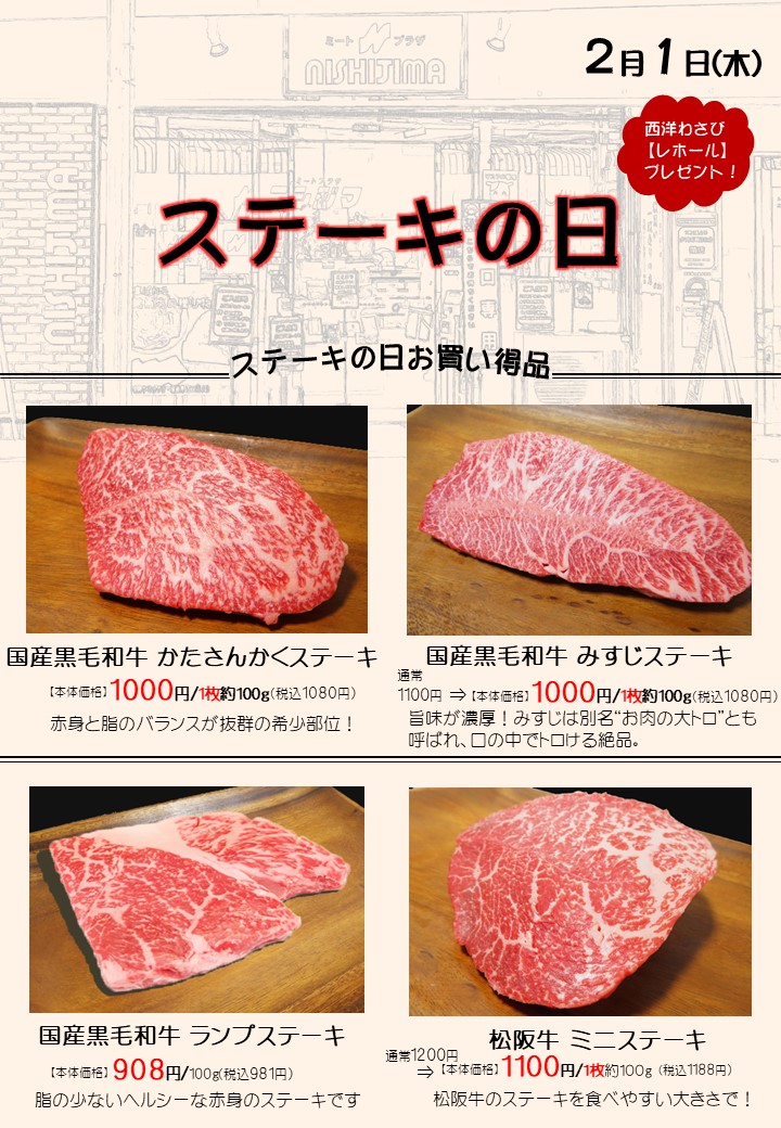 【ミートプラザニシジマ】ステーキの日★ 明日2月1日(木)に「ステーキの日」を開催‼️ 人気のステーキを、お買い得価格で販売致します😊 #黒毛和牛 #松阪牛 #みすじ #ランプ #かたさんかく #ステーキ