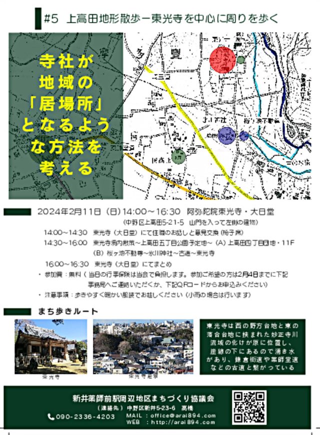 2/11(土祝)14時から、新井薬師前駅周辺まちづくり協議会主催にて、上高田4-5丁目付近中心のまち歩きが開催されます。東光院のご住職のお話しを伺うことができる貴重な機会!