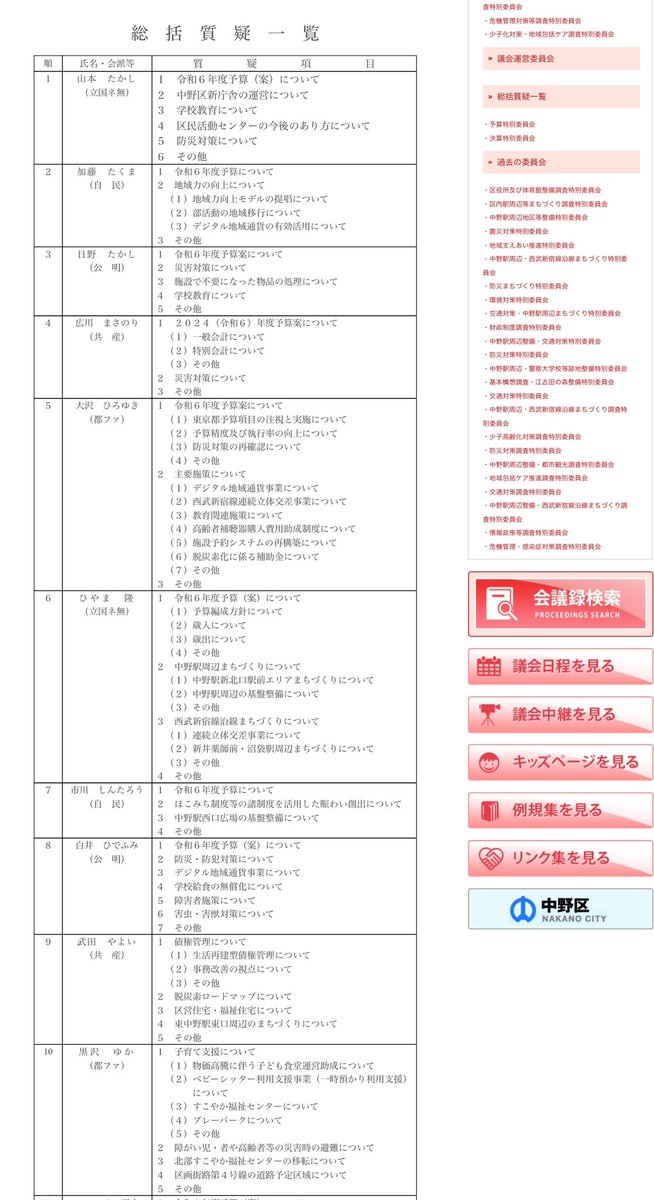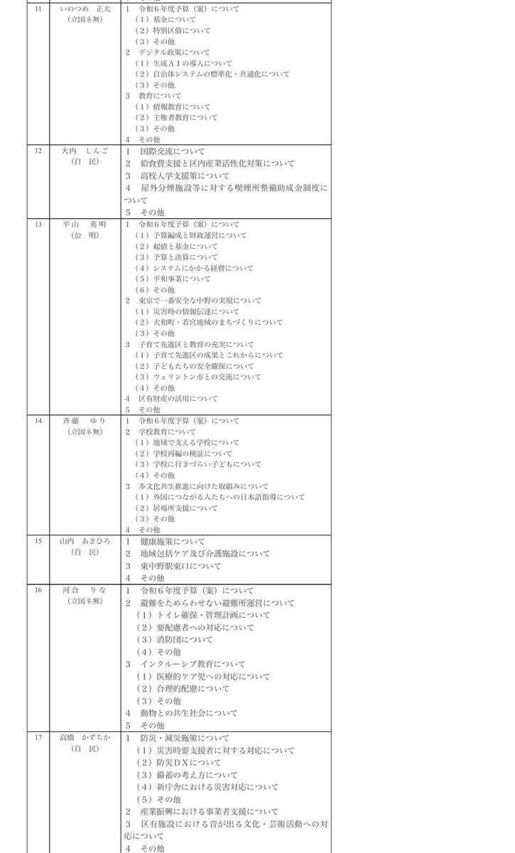 私は産休中ですが、#中野区議会 は明日からR6年度予算の総括質疑が4日間にわたり行われます。会派からは山本たかし、ひやま隆、いのつめ正太、斉藤ゆり、河合りな各議員が登壇します。いくつか仲間に託した質問もあります。10時〜17時です。どなたでも傍聴できます。