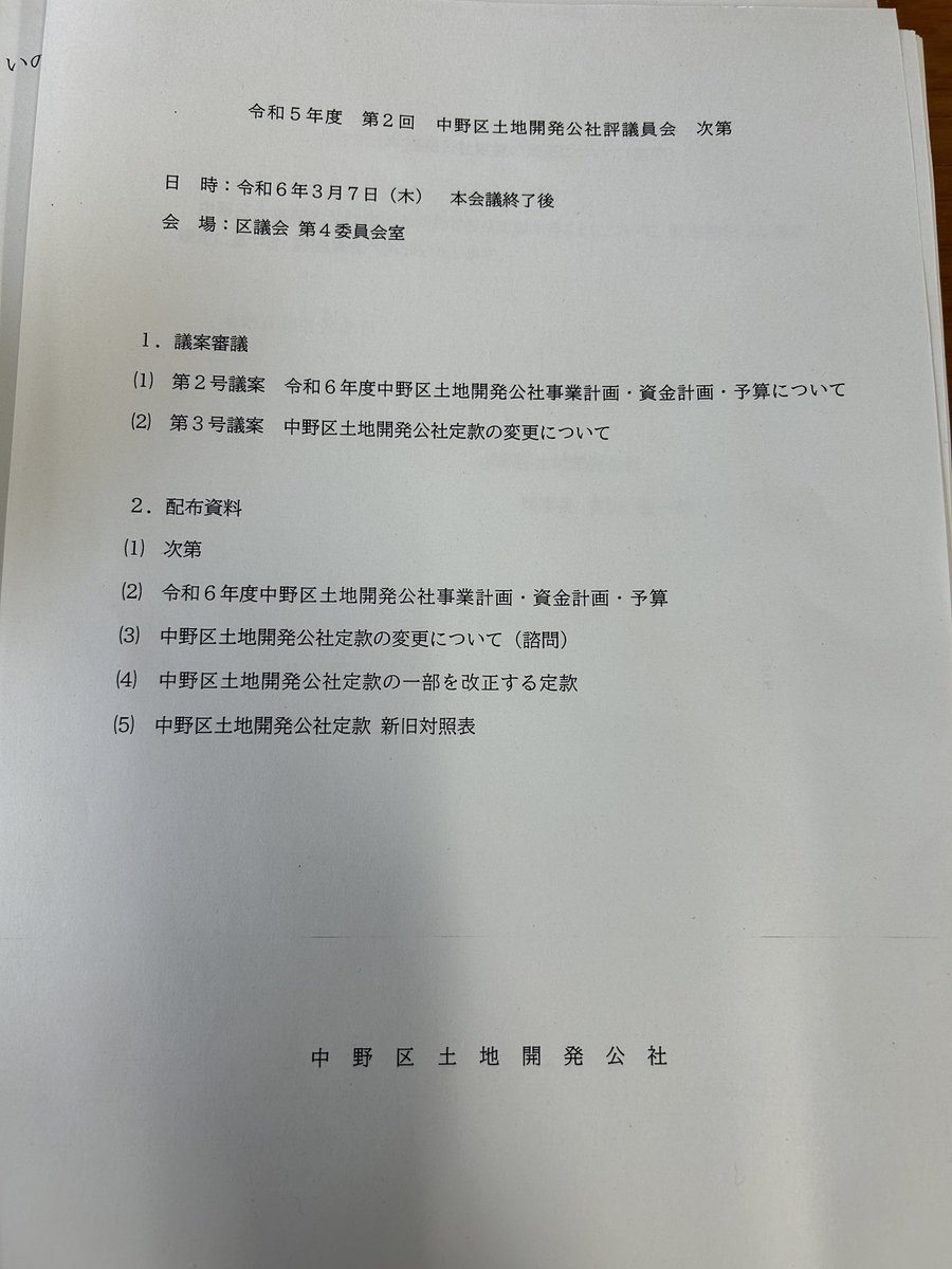 その後は土地開発公社評議員会、用地取得を柔軟に行うための法人です。用地を先立って取得し、その後に中野区が買い戻す仕組み☝️