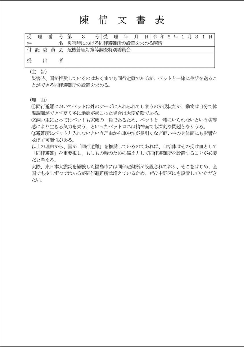 危機管理対策等調査特別委員会が昨日開かれ、その中で「災害時における同伴避難所の設置を求める陳情」の審査が行われました。(ペットと一緒に避難できる避難所の設置を求める、という内容です。)…