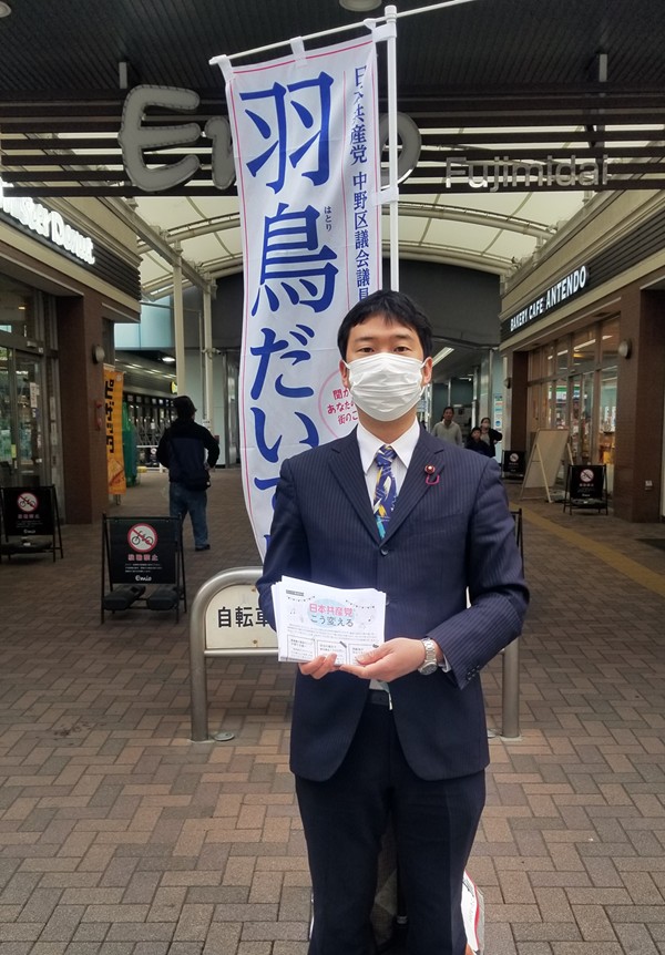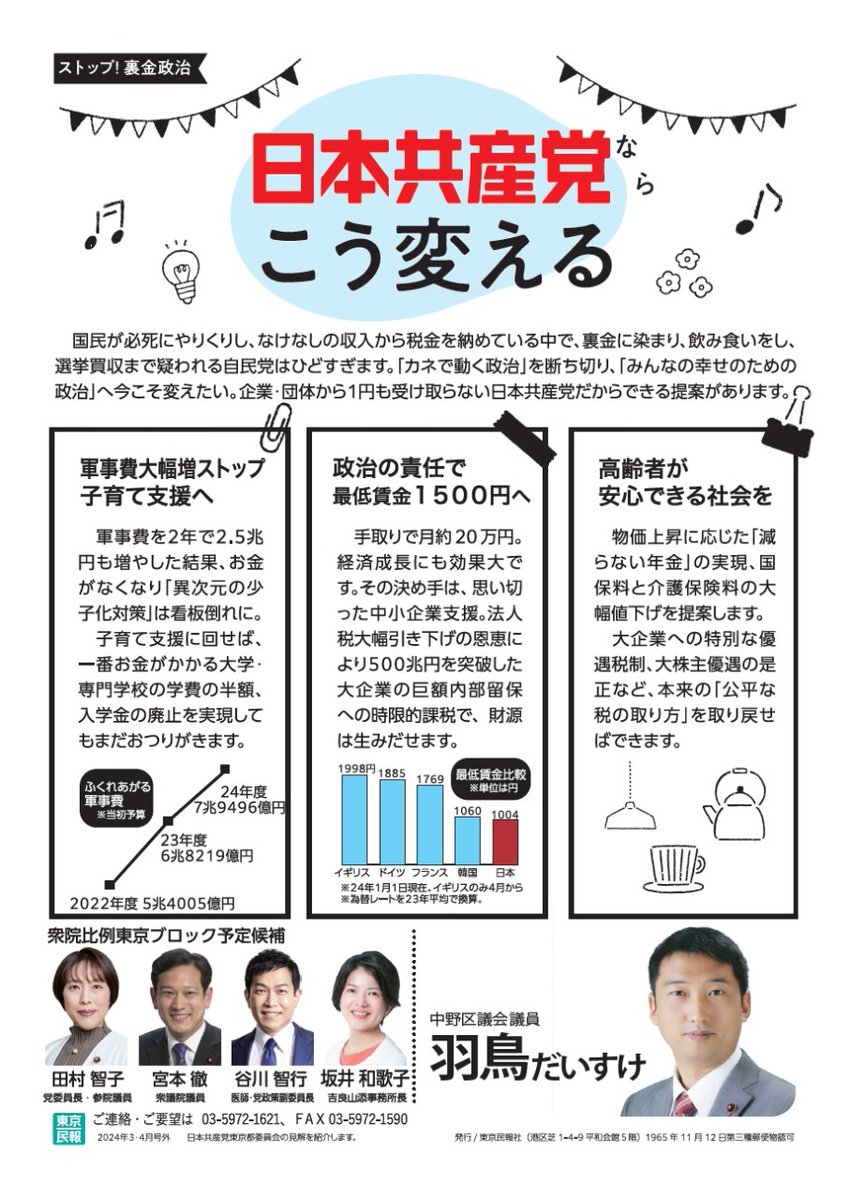 「日本共産党ならこう変える」というチラシをお配りしています。企業・団体献金を1円も受け取らない日本共産党だからこそできる提案です。