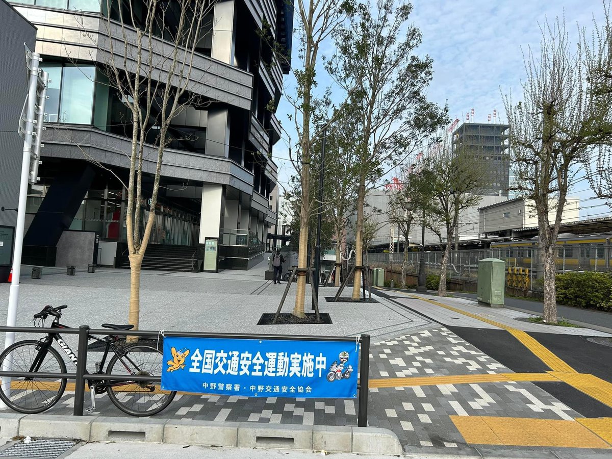 中野警察署長・中野交通安全協会会長による各町会の運動状況の巡視を受けるため、中野駅南口での朝のご挨拶は、サウステラ北東の角、丘の上の広場入口にて代替