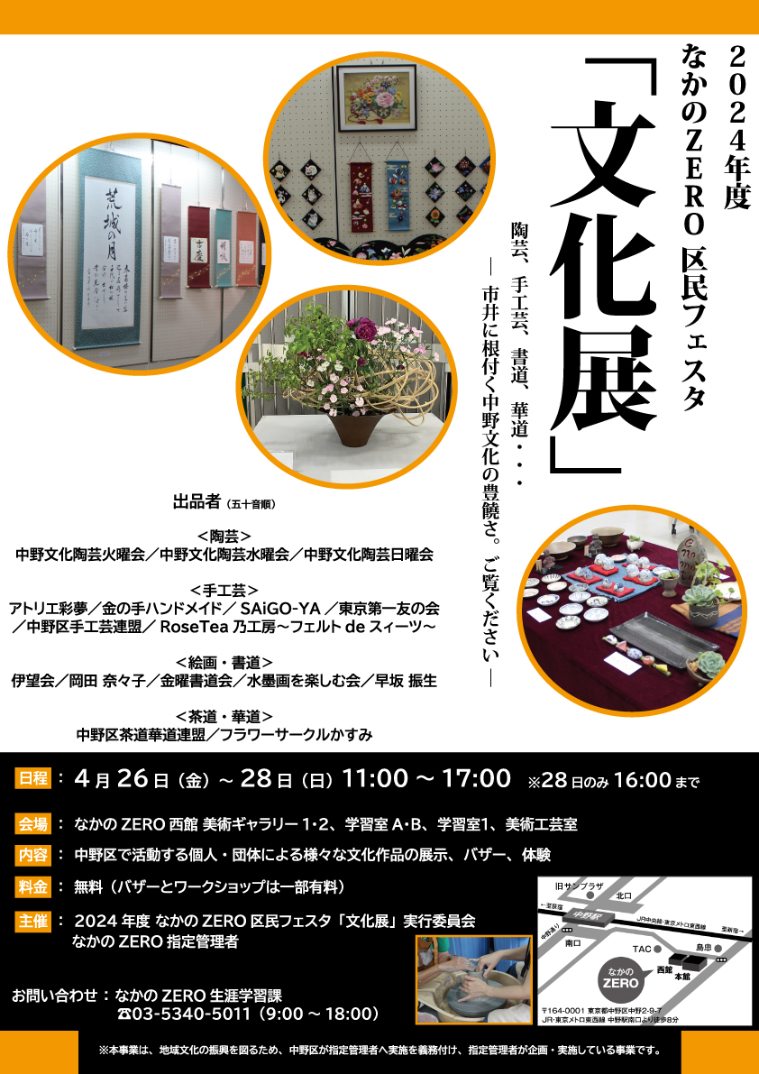 陶芸、書道、絵画、生け花、手工芸など、中野で活動する文化団体の作品を展示。