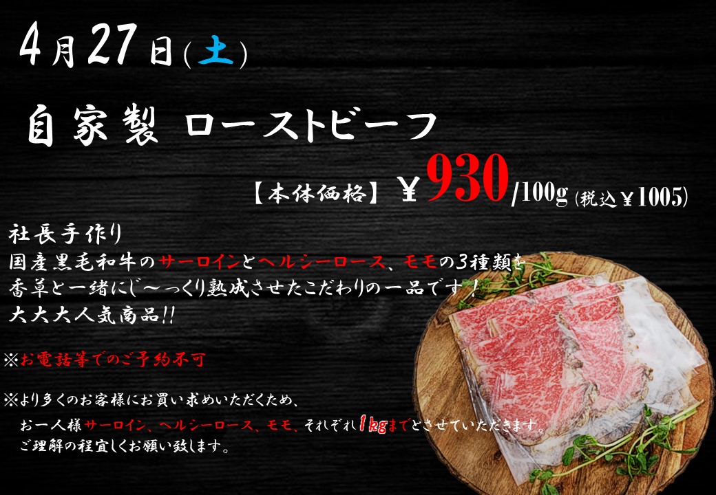 本日は限定のローストビーフを販売致します!
