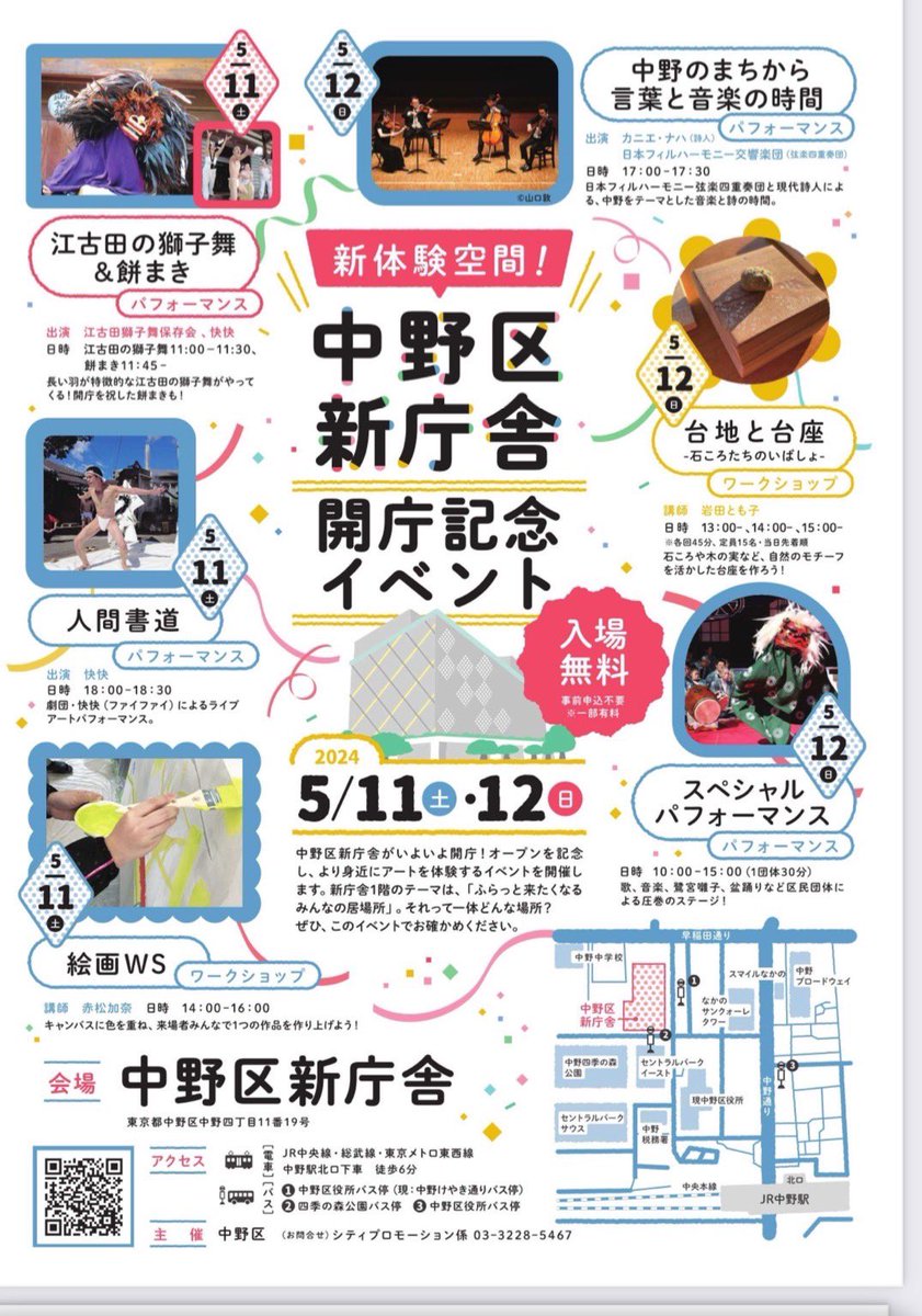 中野区役所新庁舎が本日[5月7日]より開庁致しました!開庁記念として5月11日(土)5月12日(日)に中野区新庁舎開庁記念イベントを開催!5月11日(土)の午後11時から東京都指定無形民族文化財の「江古田の獅子舞」が行われます。神秘的な獅子舞を是非ご覧下さい!その他にも様々なイベントが開催されます!