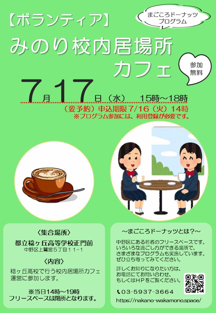 【ボランティア参加】 稔ヶ丘高校で行う校内居場所カフェの運営に参加してみませんか?(要申込) ▼日時 7/17(水)15時~18時 ▼申込 7/16(火)14時まで 詳細はチラシをご確認ください。 ▼利用登録等、お問い合わせはこちら https://nakano-wakamono.space/contact/