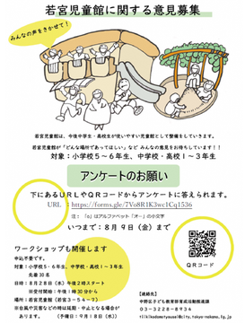 【小学5年生~高校生の方へ】 若宮児童館に関するアンケートのお願い 中野区では児童館を中高生が使いやすい場所として整備をしていきます。 「こんな設備がほしい」「こんな児童館になってほしい」など皆さんの意見を募集します! ▼回答期限 8/9(金)まで 回答はこちらから↓ https://forms.gle/7Vo8R1K3wc1Cq1536…