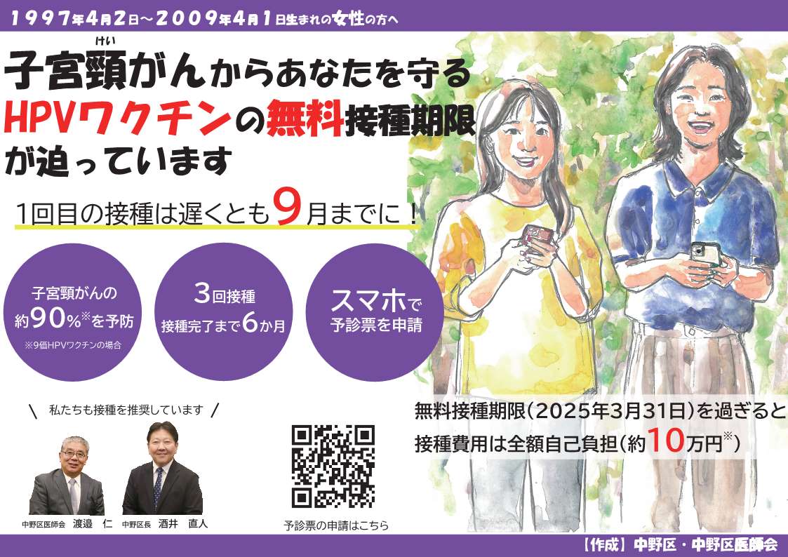 【HPVワクチンの無料接種期限が迫っています】 接種回数は3回で、完了するまでに6か月かかります。1回目の接種は9月末までに済ませましょう。 ▼対象 1997年4月2日~2009年4月1日生まれの女性 詳細はこちら↓ https://city.tokyo-nakano.lg.jp/kenko_hukushi/kenshin_yobousessyu/yobosessyu/0686333720240612130439933.html… HPVワクチン接種に関する動画はこちら↓ https://youtube.
