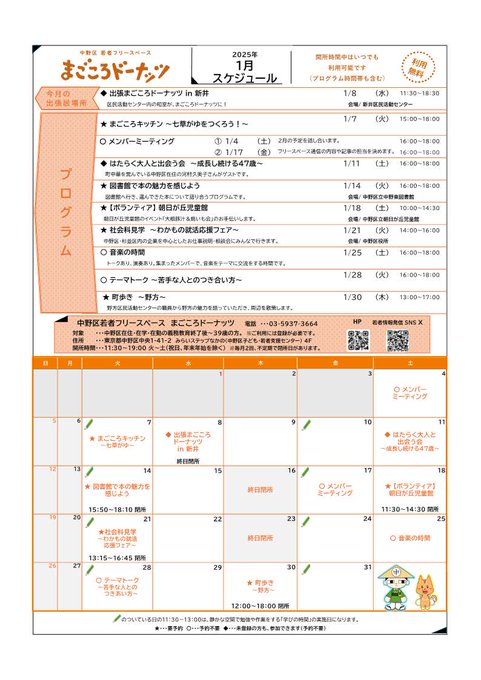 【フリースペース】1月のスケジュールをご紹介! 朝日が丘児童館のイベントボランティアや、わかもの就活応援フェアへの参加、七草がゆを作って食べたりと様々なイベントを予定しています! ぜひご参加ください! ※要事前登録 ▼利用登録等、お問い合わせはこちら https://nakano-wakamono.space/contact/