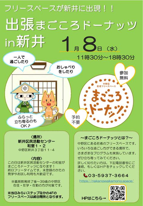 【フリースペース】「出張まごころドーナッツin新井」 フリースペースが新井区民活動センターに出張します! 見学やお試し利用も大歓迎。 ▼日時 1/8(水)11時30分~18時30分 ▼参加方法 事前予約不要。直接会場にお越し下さい。 ▼利用登録等、お問い合わせはこちら https://nakano-wakamono.space/contact/