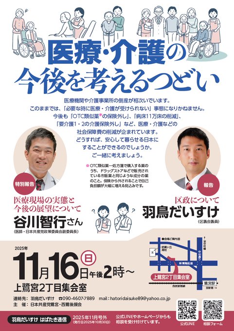 「医療・介護の今後を考えるつどい」を開催します。日本の医療・介護の現状はどうなっているのか?どうすれば社会保障を拡充して安心して暮らせる日本にすることができるのか?ともに学びましょう。11/16㈰14..