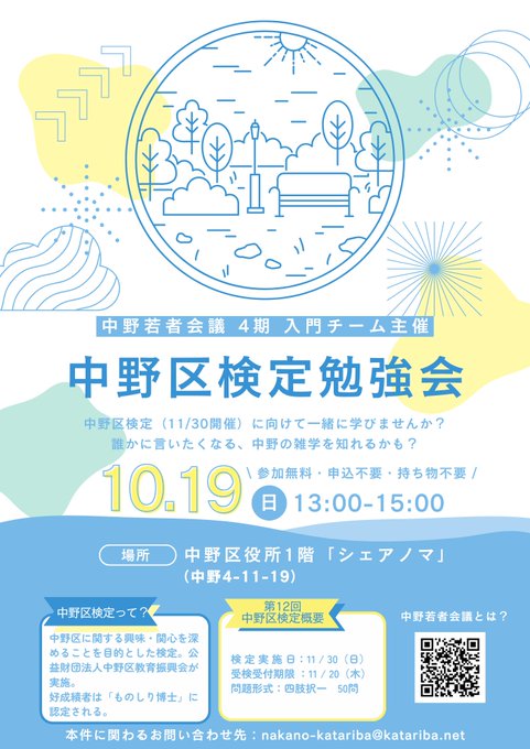 【告知中野区検定勉強会】若者会議入門チームは中野区検定(11/30開催)に向けた勉強会を開催します。中野の雑学を一緒に学びませんか?当日ご自由にお立ち寄りください!日時:10/19(日)13時〜15時..