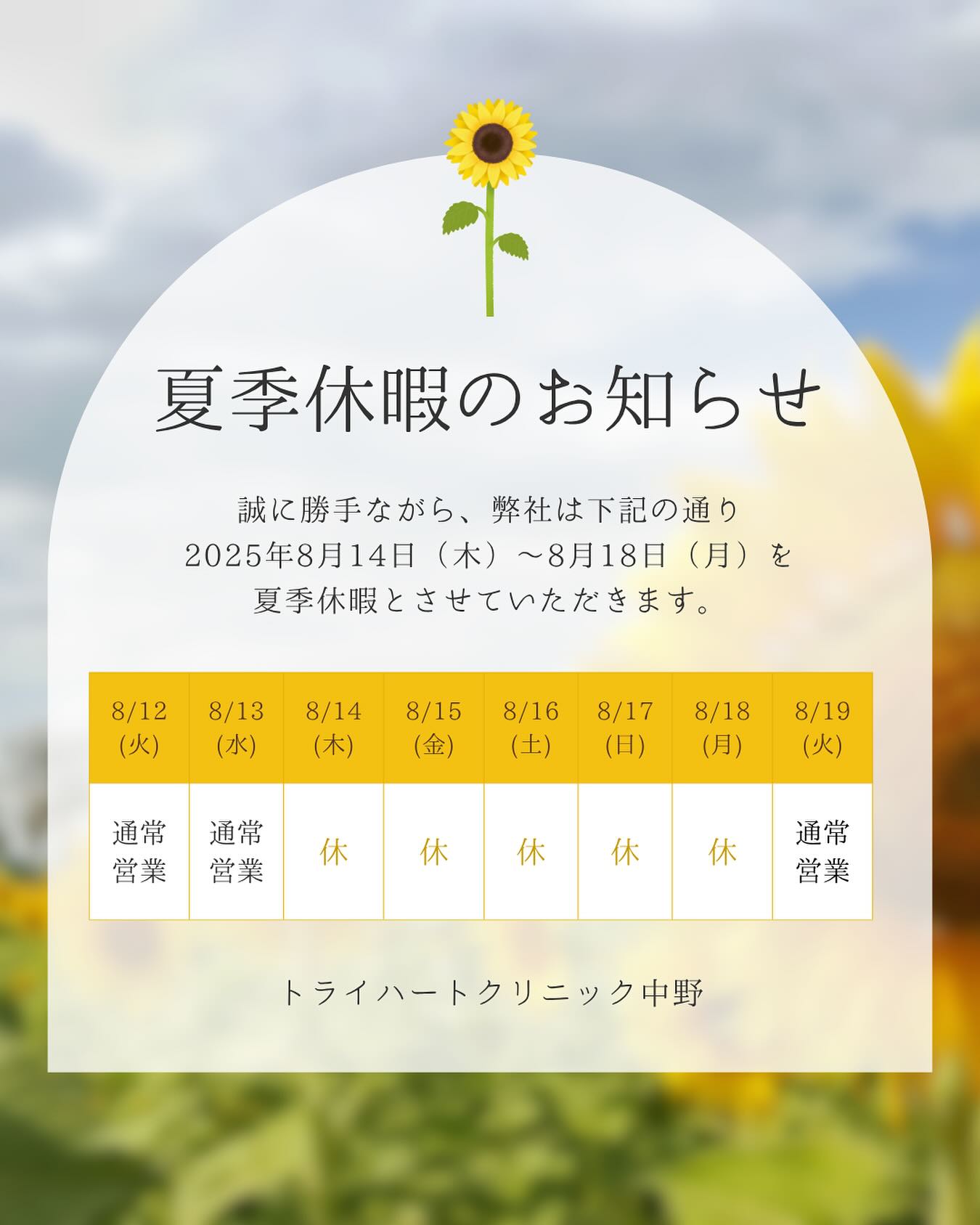 8/14木曜日から夏季休暇をいただきます。お盆前の営業は8/13水曜日までとなりますので、ご有用の際は水曜..
