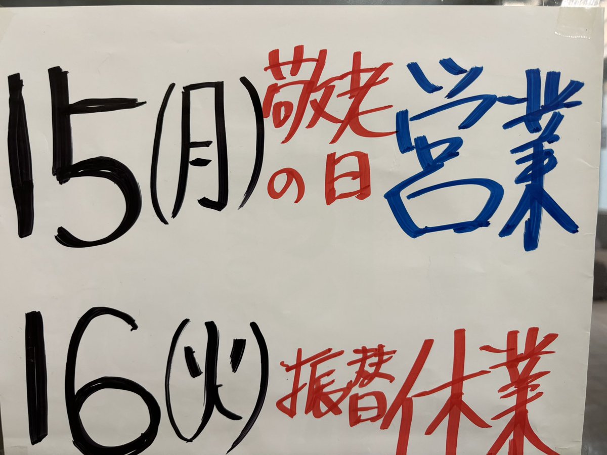 本日は月曜ですが、祝日のため営業します明日が振替休業となりますので、お間違いのないようお願いします