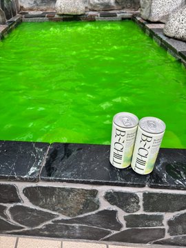 「本日は露天風呂にてビーチル湯です」ドリンクも販売しておりますので、お風呂上がりにどうぞ