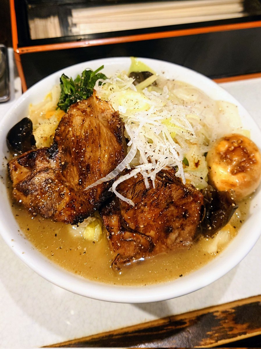 桜台【まるよし商店】『たんめん(全部のせ)』😍シッカリしたスープに太麺❗炙ったチャーシューはタレに漬けての提供。燻製卵も炙って有りより香りがたち美味しい😊タップリの野菜と一緒にワシワシと食べススメ途中で生にんにくを潰し入れるとこれまた美味しい👍ボリューム満点、美味しい一杯でした‼️