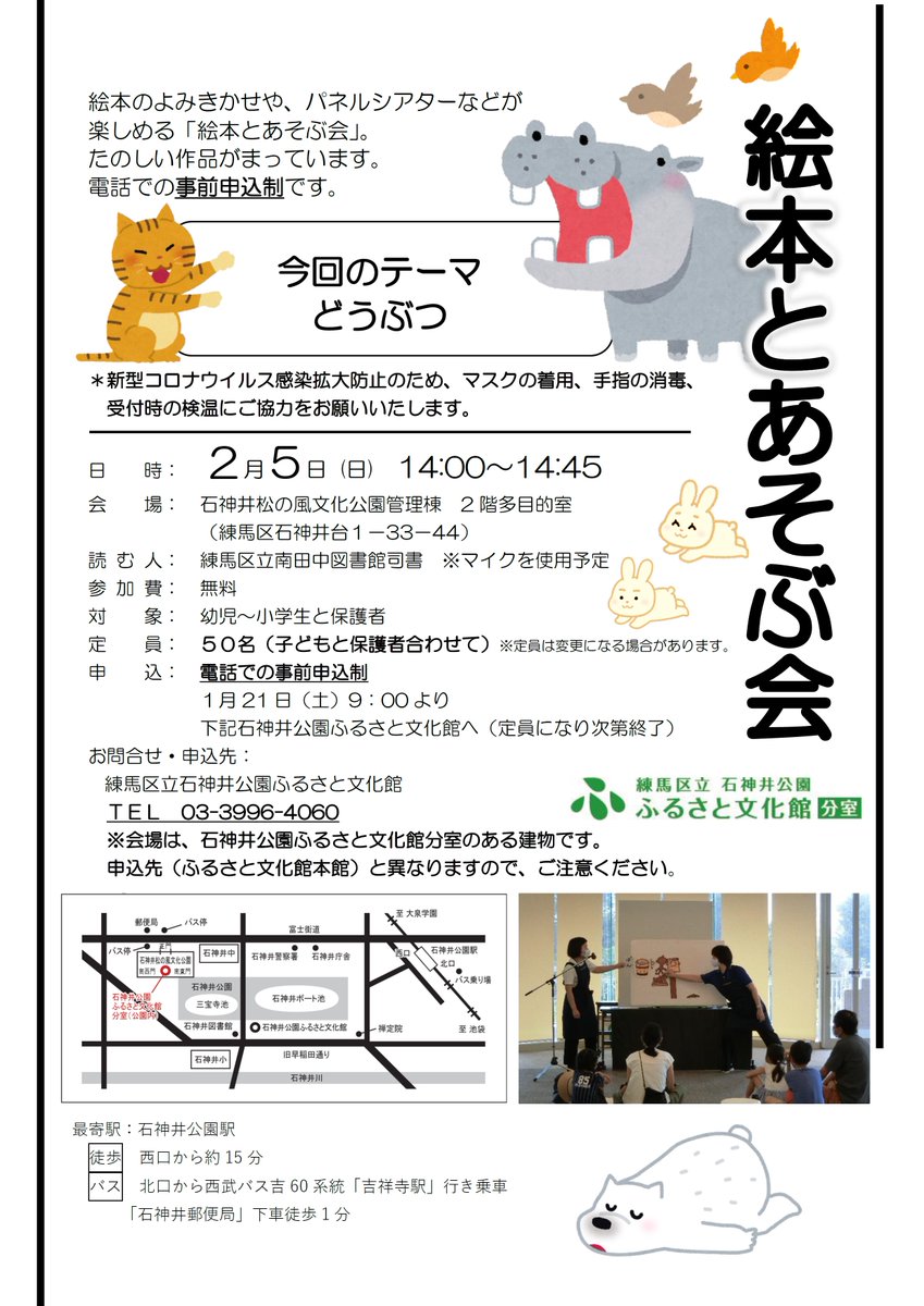 2月5日(日)に「絵本とあそぶ会」を行います。現在申込受付中!絵本の読み聞かせやパネルシアターなど楽しい時間をお過ごしください♪今回のテーマは「どうぶつ」
