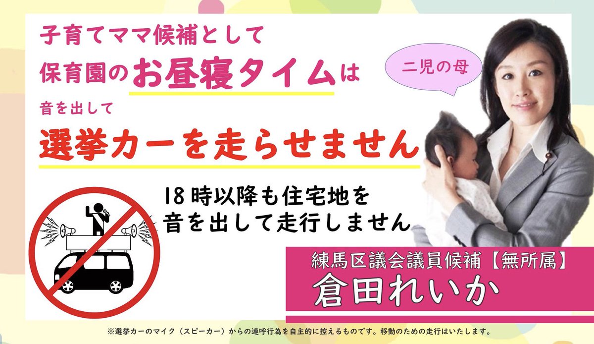 子育てママ候補として、平日保育園のお昼寝タイムと、寝かしつけタイムの18時以降は音を出して選挙カーを走らせない事にしました。どうぞご理解下さい。