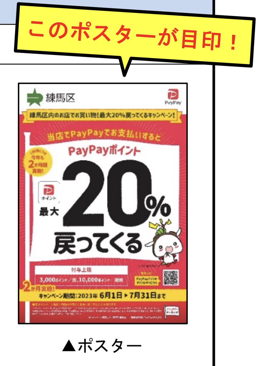 6月〜7月に「練馬区内のお店でお買い物!最大20%戻ってくるキャンペーン!」を実施。原油価格・物価高騰対策の一環として行う事業。区内対象店舗でPayPayで支払うと決済額の最大20%(期間中上限1万円相当)のPayPayポイントが付与されます。対象店舗はアプリから検索可。詳細www.city.nerima.tokyo.jp/kus..