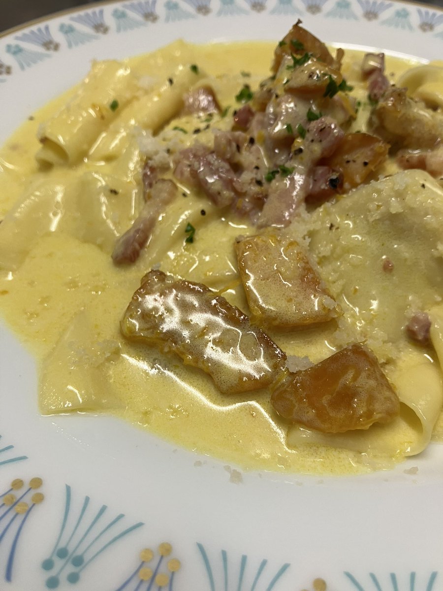 "ベーコンとカボチャのクリームソース手打ちパッパルデッレ"